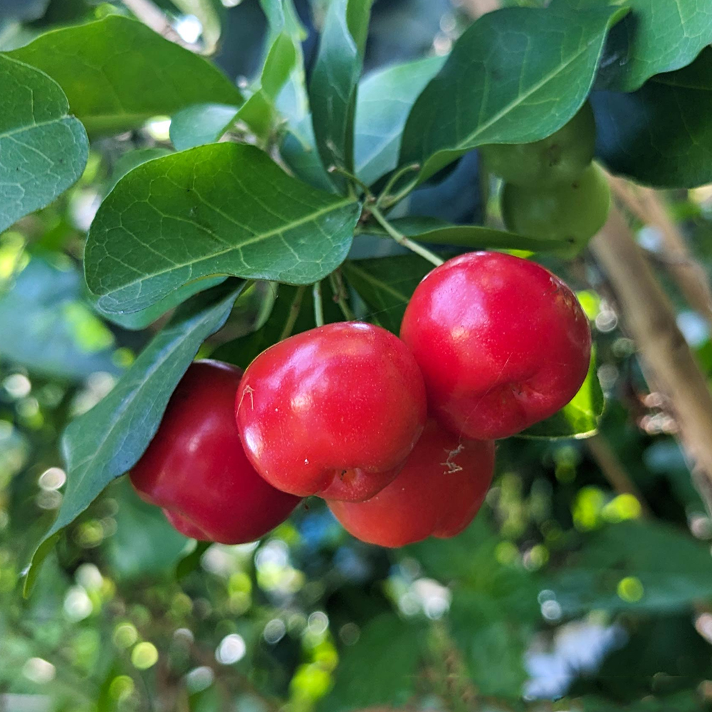 Barbados Cherry is known as Malpighia emarginata is a tropical fruit-bearing shrub or small tree in the family Malpighiaceae. Common names include acerola cherry, Barbados cherry, West Indian cherry, and wild crepe myrtle. Acerola is native to South America, southern Mexico, Puerto Rico, Dominican Republic, Haiti, Brazil, and Central America, but is now also being grown as far north as Texas and in subtropical areas of Asia, such as India.  It is known for being extremely rich in vitamin C, almost as much as camu camu, although M. emarginata also contains vitamins A, B1, B2, and B3, as well as carotenoids and bioflavonoids, which provide important nutritive value and have antioxidant uses.