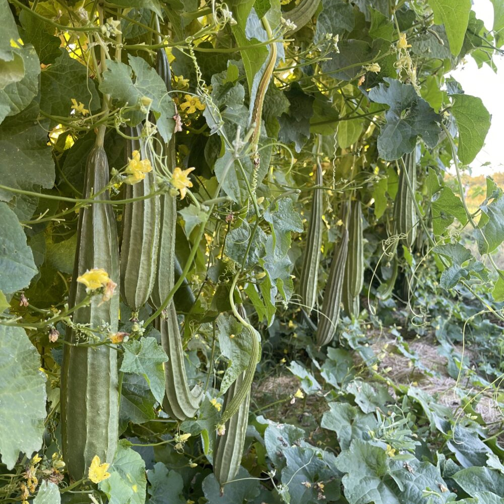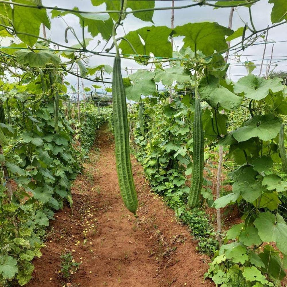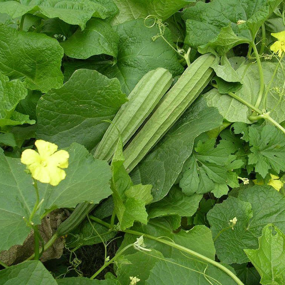 Ridge gourd, known as Beerakaya in Telugu, is a climbing vine that produces long, green, ridged fruits. The plant is known for its vigorous growth, thriving in warm, humid climates with plenty of sunlight. The fruits are tender when young and can be used in curries and stir-fries. As the fruit matures, the flesh becomes spongy and contains white seeds, which can also be used as a natural sponge.